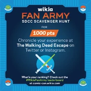 This year, go viral with your SDCC experience by joining our Wikia Fan Army. A limited number of Wikia Fan Army scavenger hunt cards will be passed around by fans at the show. This card details your first mission to complete on Twitter or Instagram using the hashtag #WikiaFanArmy, and then you pass the card to another person. Once completed, you’ll receive a list of remaining missions from @Wikia. All missions are worth points, and the fans with the highest points at the end of SDCC will win amazing prizes, provided by Sideshow Collectibles .